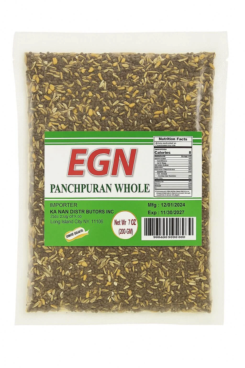 Aromatic EGN Panch Puran (Five Spice Mix) for authentic Bengali and Eastern Indian cuisine. Blend of whole cumin, fennel, mustard, fenugreek, and nigella seeds. Perfect for tempering dal and vegetable curries. 7oz pack.