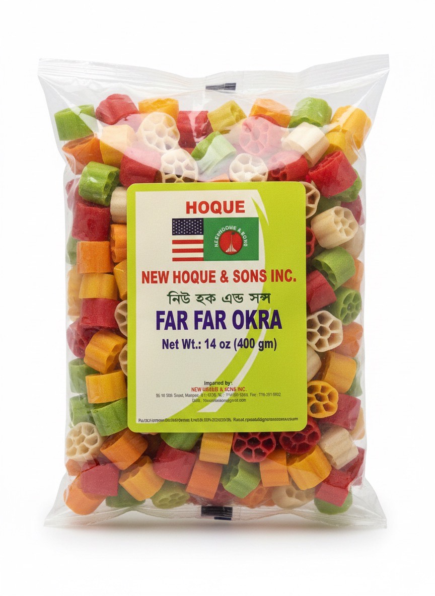 The Hoque Far Far mix features an assortment of vibrant colors (red, green, orange, white) and is made from rice or wheat flour. It is delivered in its unfried state, giving you the flexibility to prepare it fresh at home.